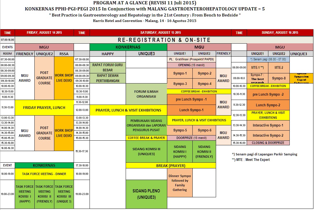 Sekilas susunan acara Konkernas PPHI-PGI-PEGI in conjuction with Malang Gastroenterohepatology Update (MGU) 5 dapat dilihat pada program at glance dibawah yang berisi tentang informasi waktu, tempat dan jenis acara yang akan berlangsung selama acara tersebut ,mulai dari tanggal 14 - 16 Agustus 2015. Acara ini terbagi menjadi 2 sesi yaitu acara Konkernas dan Malang Gastroenterohepatologi Update (MGU) - 5.